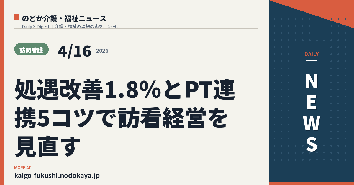 2026年4月16日のX上では、訪問看護分野で「6月からの処遇改善加算による訪問看護1.8%アップ」「理学療法士(PT)との連携を深める5つのコツ」「467名のケアマネ調査に基づく情報連携課題」「医療的ケア児の在宅医療と付き添い入院」が経営・連携の観点で話題になりました。令和8年度報酬改定後のステーション運営と、多職種連携の効率化をどう進めるかという実務視点の発信が中心です。本記事では制度・経営・連携の切り口から、注目度の高かった4件を取り上げます。